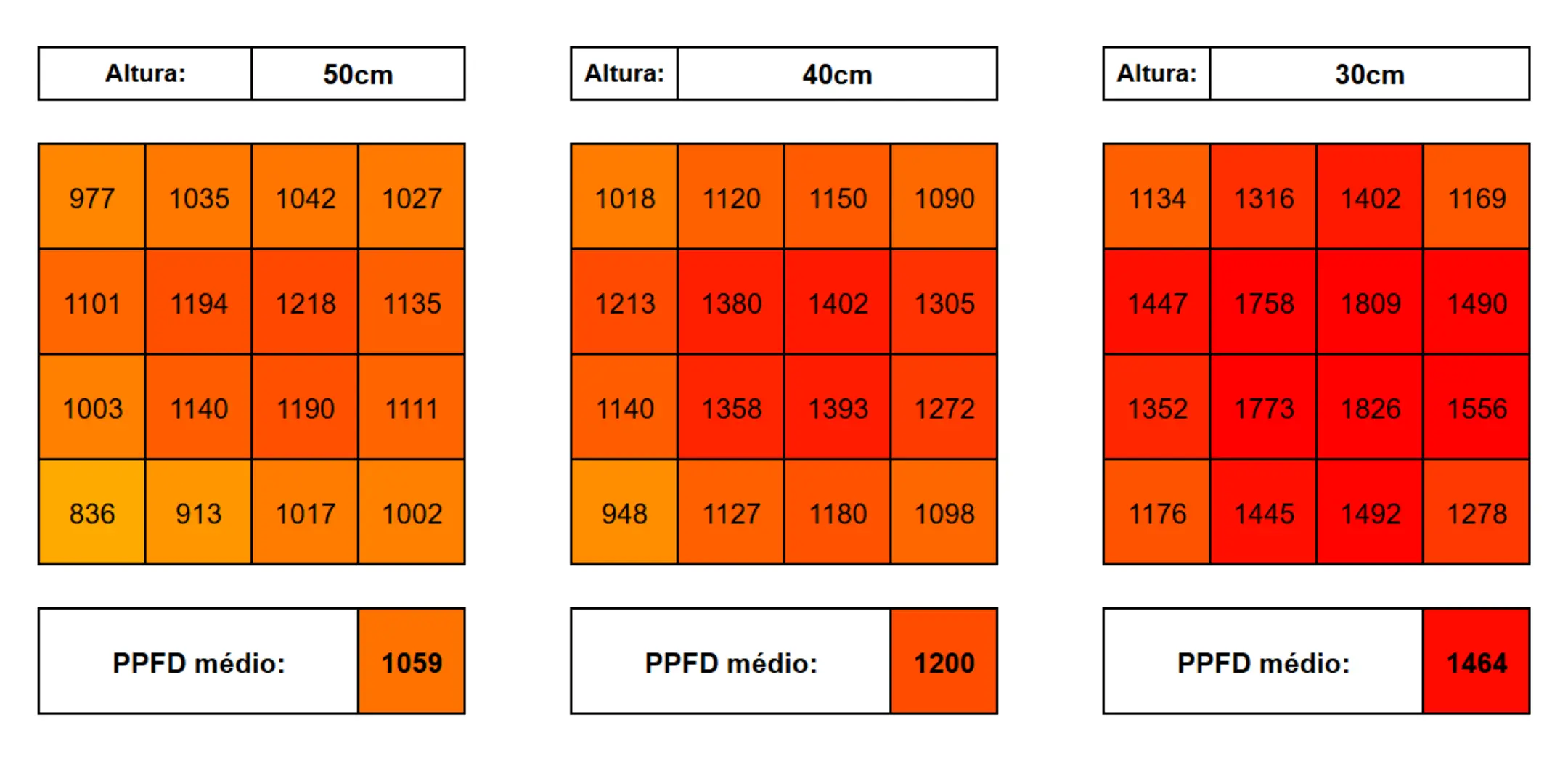 • 30 cm de altura: alcançou 1464 de PPFD.
