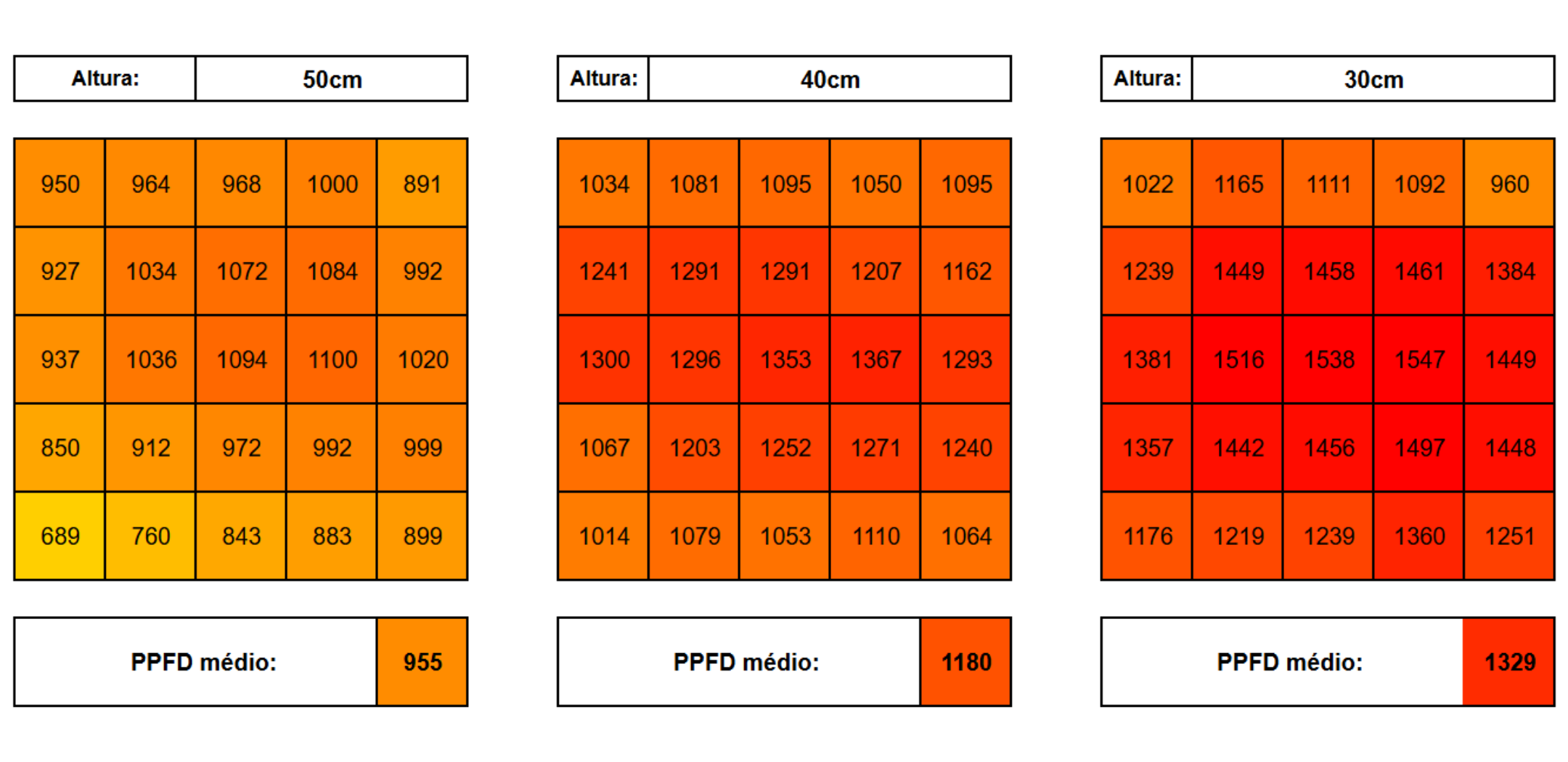- 30 cm de altura: 1329 de PPFD.